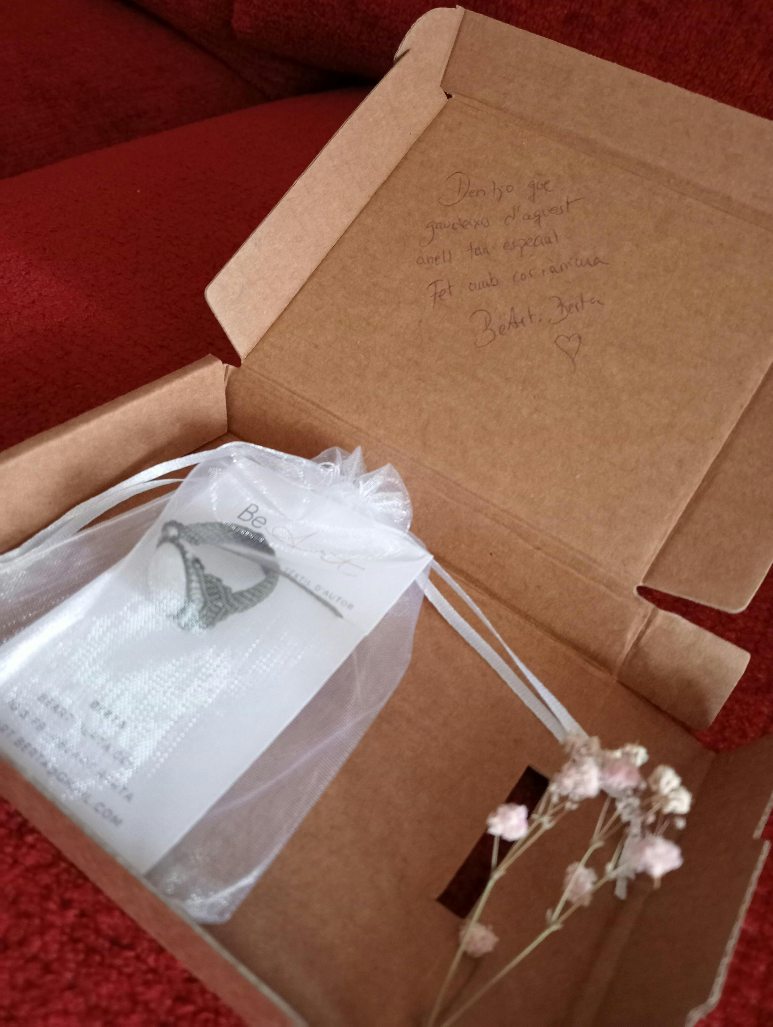 Este es el envoltorio que encontrarás en el sobre, una caja de unos 10x12cm y 2cm de grosor. Dentro encontrarás la joya en una bolsita blanca semitransparente y una tarjeta de BeArt con una nota personalizada especial para ti o la persona a la que va dirigida la joya. Por favor, indícame si quieres que añada una nota tuya en caso de regalo y estaré encantada de transcribirla y ponerla en la caja de regalo.