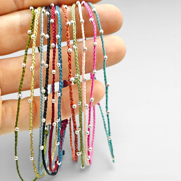 La pulsera Fugaz tiene bolitas mini de plata de ley a lo largo de la pulsera y parece como la cola de una estrella fugaz.